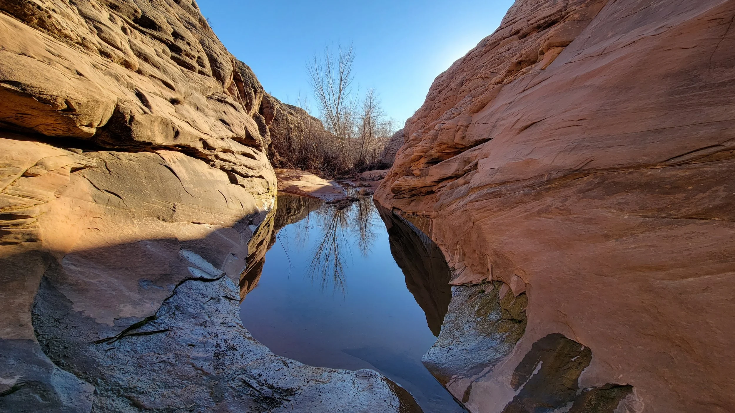 By nightfall I was still six miles short of my permitted campsite. My estimation of two hours was very generous. I love night hiking, it's an excellent way to squeeze miles out of a day if your body is up for it. Night miles are also a necessity if you want to keep pace with mileages found on summer thru-hikes (I'm looking at you, forty-mile days on the PCT). But route finding in the dark takes dead reckoning to a whole new level. On the Grand Enchantment Trail, most night hiking was in open arroyos, or on ranching roads. My first night on the Hayduke has been filled with miles of dense willow thickets— every step a crash. Some thickets of willow were so dense that I could rarely see more than six or seven feet ahead of me. Half an hour into this dance of high-stepping and head-ducking, I rammed my knee into the end of a large dead tree laying across the wash. Several pieces of wood lodged deep into my knee, and would remain there for over a week until I noticed the resulting infection and squeezed them out 120 miles later. Did I mention it was freezing? There was still plenty of wet walking and quick sand, but courthouse creek occasionally dried out or fanned out into a half dozen dry beds, all packed thick with willows and some desert plant with dozens of spiked seed pods the size of almonds. These clung to every stitch of fabric I had from the waist down. After two hours of slow and grueling progress, I gave up and laid out my bedroll on a plateau overlooking the wash. The next morning I was delighted to find that the worst of the bushwhacking was over.