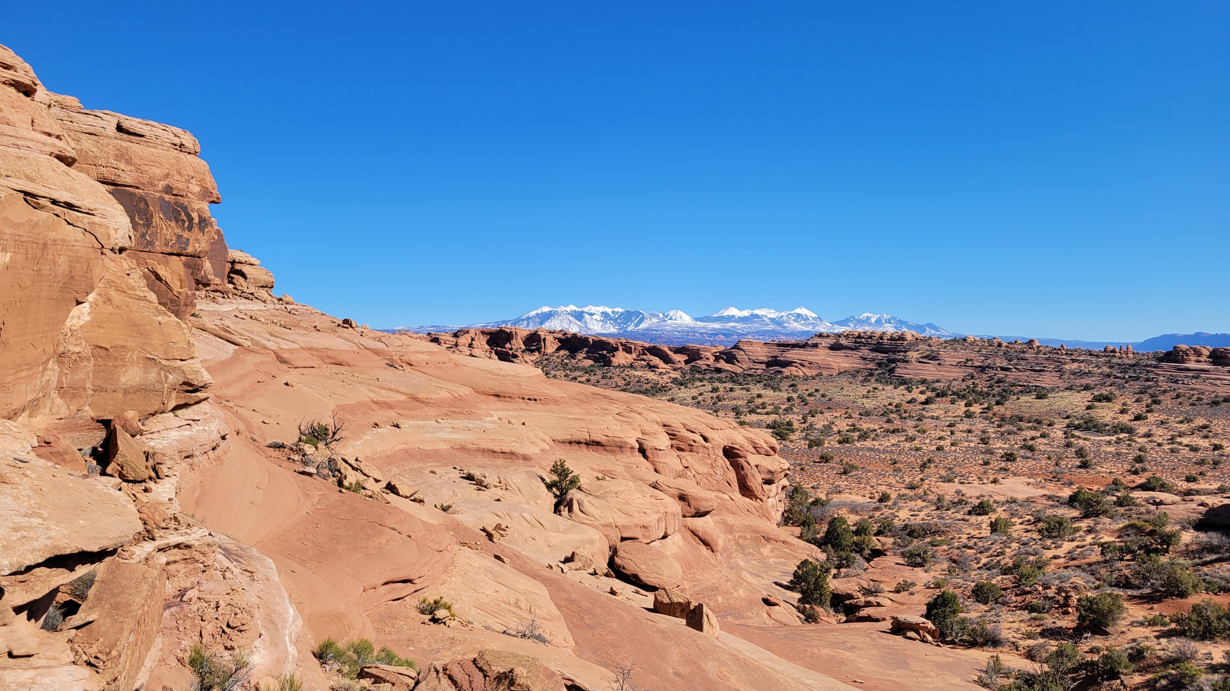 One advantage of night time lows in the teens is that if you’re walking in a wash with an abundance of water-saturated sand, the sand freezes and becomes rock hard. The morning of day two made for some quick miles before navigating a dozen or so creek crossings via cottonwood branches placed haphazardly over chest-deep water with an icy shield across its surface. Eventually the sand thawed out and my route actually joined a trail in lower Courthouse Wash. By lunch I had emerged at a road on the south side of Arches National Park and began the roadwalk into Moab to resupply for the next section. I hit the grocery store, got a short ride back to my route, and continued on. The rest of day two consisted of a twenty mile road-walk out from Moab through Kane springs up to Hurrah Pass. There was plenty of traffic, even well after the road turned to dirt. I walked past many boulders covered in petroglyphs. It kept the route interesting. I pitched my tarp on top of Hurrah pass and hunkered down for a light shower and strong winds that battered me all night. There were no windbreaks anywhere near the pass, I couldn’t walk any further, and it was hard enough finding a flat spot I could actually wedge my tent stakes in. Several popped out throughout the night and I scrambled to collect rocks large enough to weigh down my guylines and keep me dry.